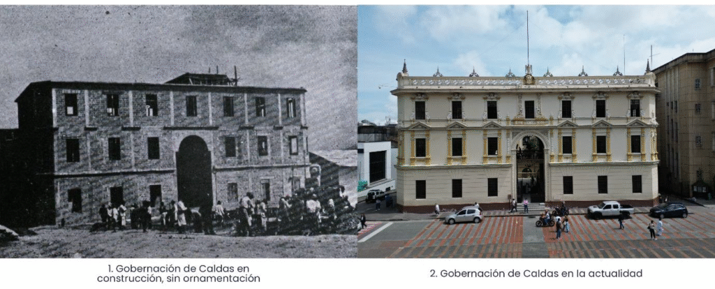 Figura No. 2. Imagen 1: Arias Hurtado, V. (s.f). Gobernación de Caldas en construcción, sin ornamentación. Imagen 2: Román, S. (2023). Gobernación de Caldas en la actualidad.
