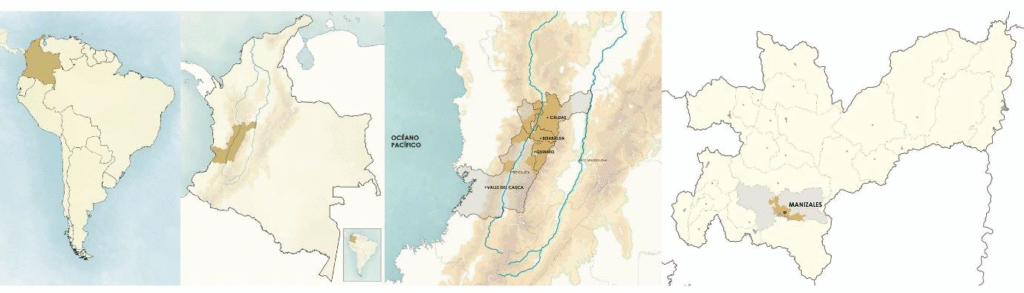Manizales es una ciudad colombiana con, aproximadamente, quinientos mil habitantes, ubicada en la Cordillera de los Andes a 2160 m.s.n.m.m., con una temperatura promedio de 20°C (Figura No. 1). Fue fundada en 1849 en el marco de un fenómeno de poblamiento de la parte alta de la cordillera del centro occidente de Colombia, conocido como “la colonización antioqueña”, período durante el cual se fundaron cerca de cien poblaciones a lo largo del siglo XIX. En la segunda mitad de este siglo XIX llegó el café a la región, producto que encontró aquí unas condiciones climáticas y topográficas ideales para su cultivo, en unas tierras de origen volcánico, bañadas por aguas que fluían de la parte alta de las montañas bañando las laderas y distribuyendo así su carga de nutrientes naturales. Estas condiciones, sumadas al régimen de lluvias y sus temporadas intermitentes de sol, hicieron que se diera un café de excelente calidad y en grandes cantidades. (Chalarca, 1998, p. 11).