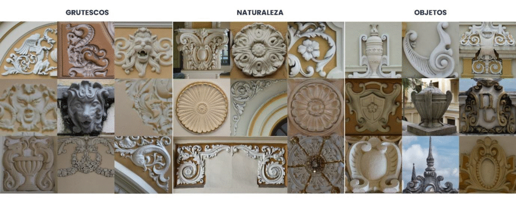 Es así, que, durante el renacimiento, surge un espíritu por conocer la naturaleza lo cual se ve reflejado en la estética, en donde estas figuras naturales y humanas buscan reflejar de la manera más realista posible, siendo representadas en obras artísticas y en la ornamentación de los edificios. En la clasificación realizada para este trabajo se identificaron los siguientes elementos que fueron agrupados en este: rosetones se identificaron 12 tipos y un total de 172 piezas; hojas de acanto, se identificaron 20 tipos y un total de 332 piezas; palmetas, se identificaron 13 tipos y un total de 237 piezas; capiteles, se identificaron 12 tipos y un total de 136 piezas; ménsulas, se identificaron seis tipos y un total de 66 piezas. Este grupo representa el 54% de todos los elementos identificados.