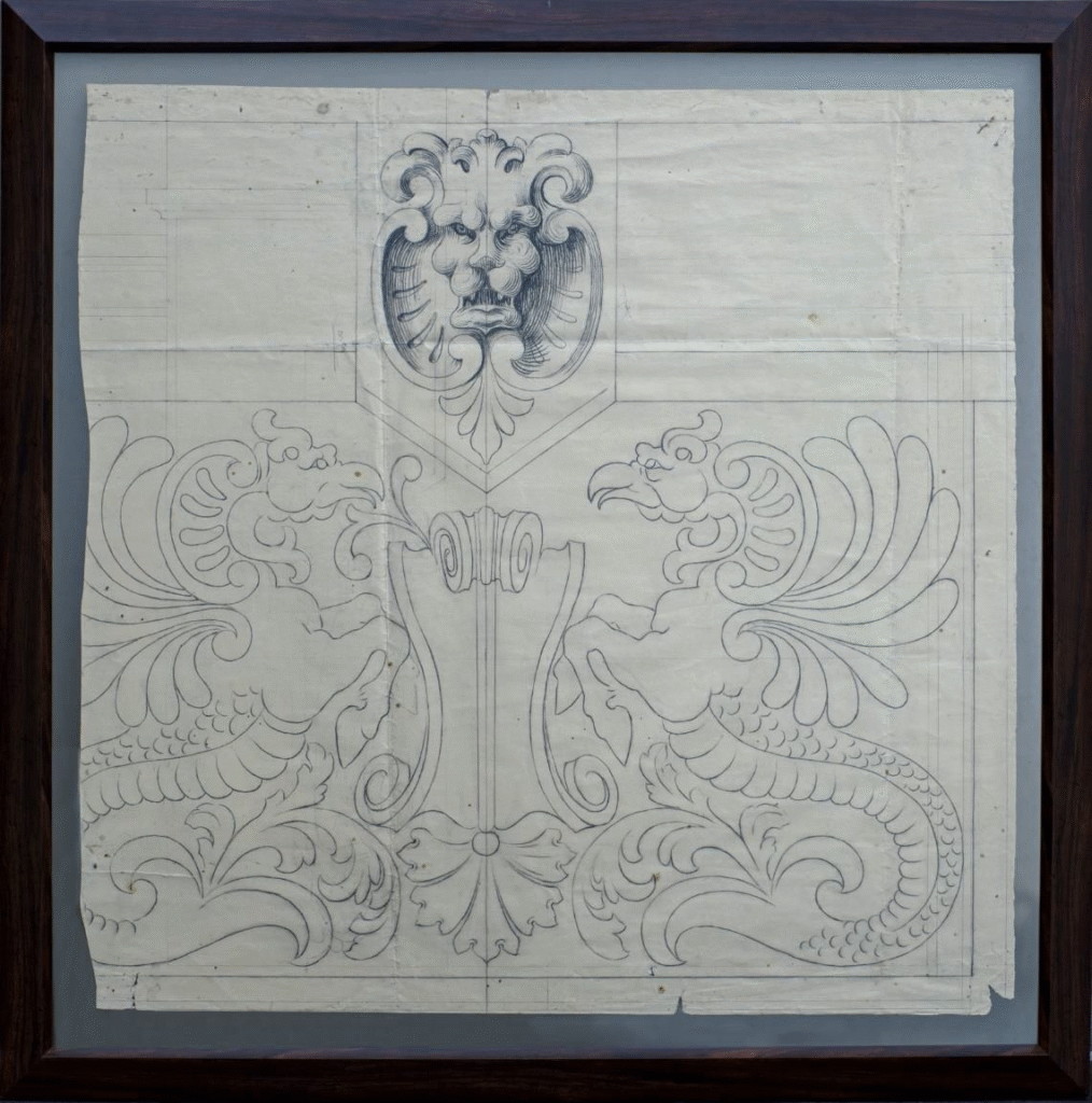 Figura No. 4. Sarmiento, J. (2023). Dibujo hecho en lápiz sobre papel mantequilla realizado por Belisario Rodríguez, ornamentación Gobernación de Caldas.