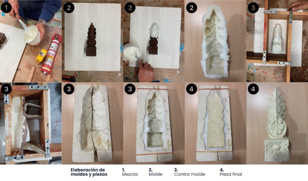● MOLDE EN YESO Y CEMENTO: El molde más sencillo y económico de elaborar es en yeso, ideal para piezas pequeñas y fáciles de moldear para exponer en el interior del edificio; también se podían hacer en cemento para piezas de mayor tamaño como ánforas, jarrones, pináculos, que se podían exponer a la intemperie. A las piezas de cemento se les ponía un refuerzo interior en varillas de hierro figurado para mejor agarre de la mezcla. Sin embargo, en caso de necesitar piezas más complejas se puede usar este sistema haciendo todo por segmentos para luego ensamblarlos como un rompecabezas y obtener la pieza deseada.