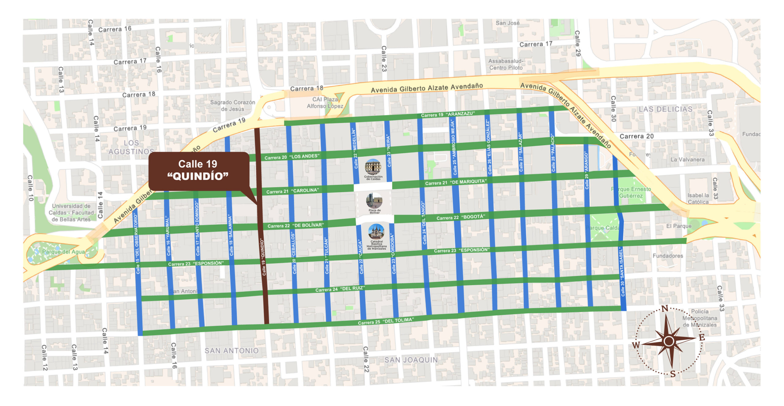 Esta denominación alude al camino del Quindío, una de las rutas más duras y significativas de la colonización, que comunicaba el Alto del Quindío con el valle del Cauca. En la época de la fundación de Manizales, este paso era referencia obligada en los viajes entre Antioquia y el centro del país. La “Calle Quindío” conserva la memoria de esa geografía agreste que unió montañas, viajeros y comercio.